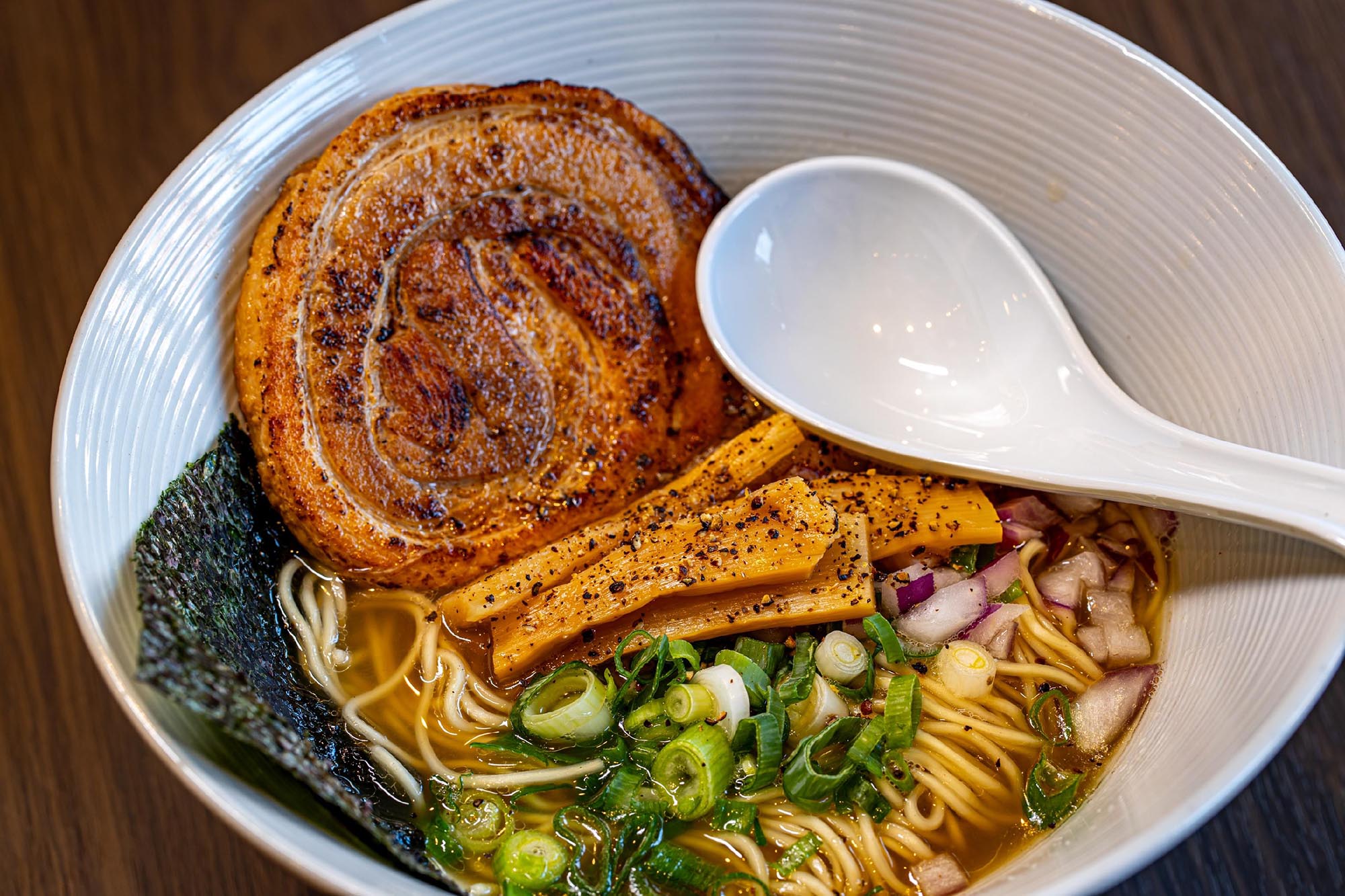 Crafted with unwavering dedication, our rich, velvety broth simmers for 18 hours to extract maximum depth and flavor. Each bowl is adorned with tender, slow-roasted, charred chashu pork and complemented by our meticulously prepared toppings, including perfectly seasoned eggs – all reflecting generations of Japanese culinary mastery.
